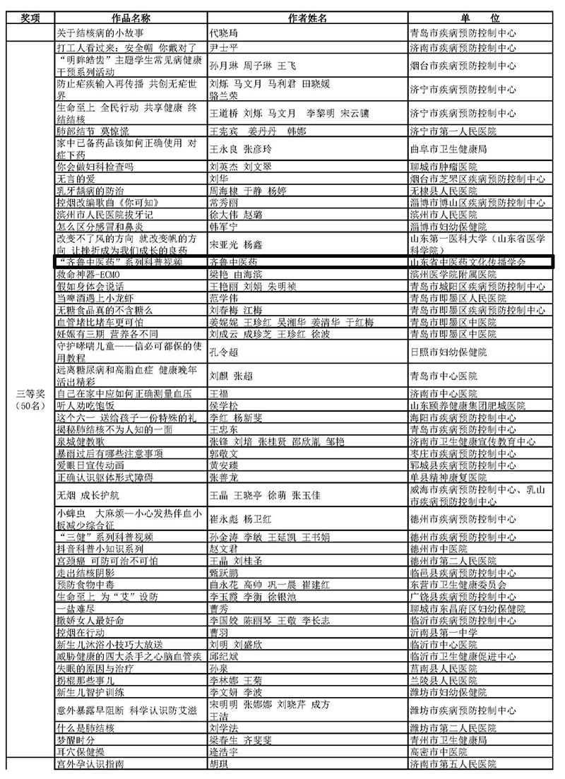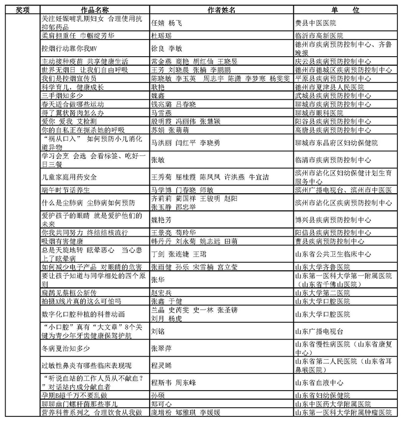 据悉,大赛自7月启动以来,受到社会各界广泛关注和积极参与。经过前期申报、各市组织初评、省属及国家驻鲁单位推送,566件健康科普新媒体短视频作品进入省级终评。大赛组委会秉承“公平、公正、公开”的原则,组织专家复审、终审并经社会公示,共评选出新媒体短视频作品一等奖10名、二等奖30名、三等奖50名、优秀奖90名,同时评选出优秀组织奖16个及特别贡献奖3个。