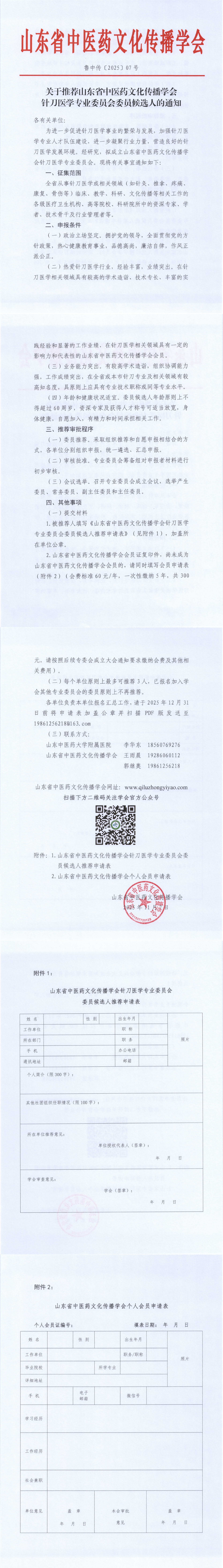 各有关单位:为进一步促进针刀医学事业的繁荣与发展,加强针刀医学专业人才队伍建设,进一步凝聚行业力量,营造良好的针刀医学发展环境。经研究,拟成立山东省中医药文化传播学会针刀医学专业委员会。现将有关事宜通知如下:关于推荐山东省中医药文化传播学会针刀医学专业委员会委员候选人的通知(2).docx关于推荐山东省中医药文化传播学会针刀医学专业委员会委员候选人的通知(2).pdf