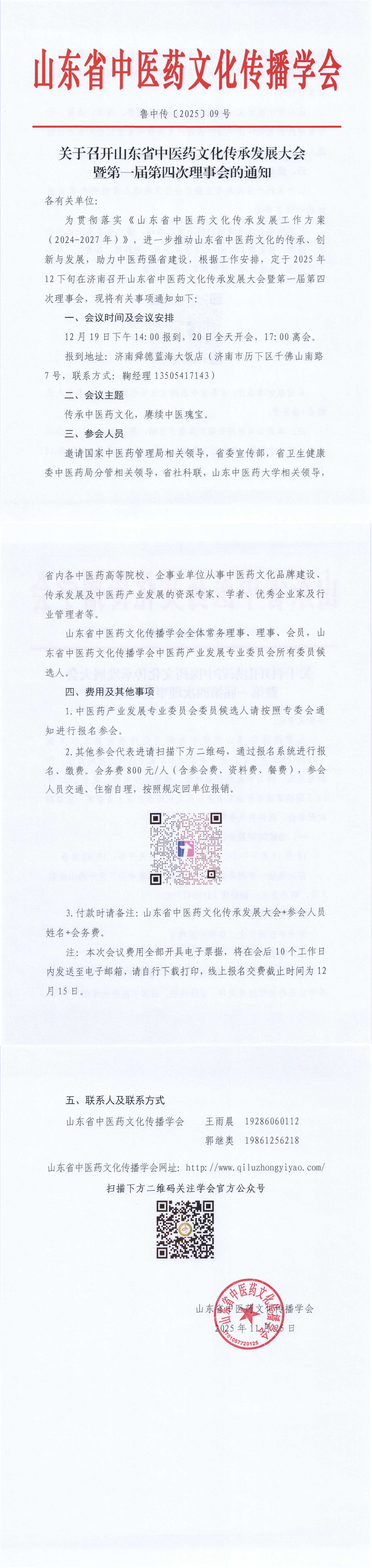 各有关单位:为贯彻落实《山东省中医药文化传承发展工作方案(2024-2027年)》,进一步推动山东省中医药文化的传承、创新与发展,助力中医药强省建设,根据工作安排,定于2025年12下旬在济南召开山东省中医药文化传承发展大会暨第一届第四次理事会,现将有关事项通知如下:关于召开山东省中医药文化传承发展大会暨第一届第四次理事会的通知(1).doc关于召开山东省中医药文化传承发展大会暨第一届第四次理事会