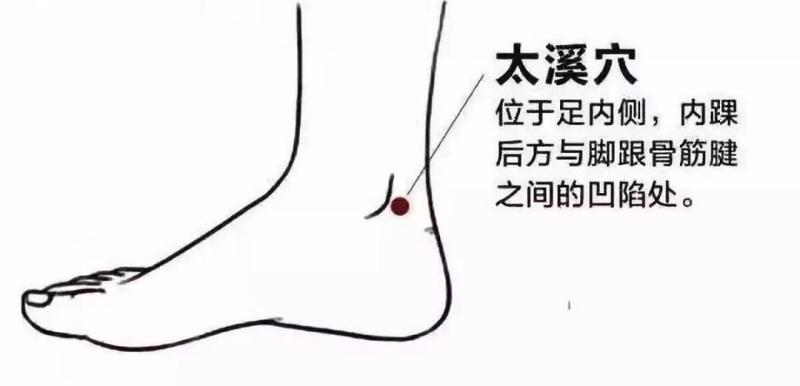 太溪穴是足少阴肾经的原穴,在足内侧,内踝尖与跟腱之间的凹陷中。按摩此穴具有清热利湿、补肾填精功效。